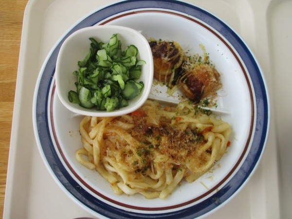 今回のお昼ごはんは、焼うどん・たこ焼き・きゅうりの酢の物・味噌汁です❤